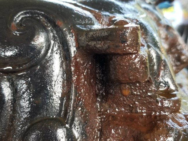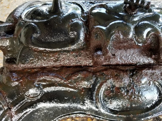 It stripped the rust back completely and I ended up with bare metal. This looks like it pitted the metal, but in reality this is how deep the 100 years of rust was. There is either stove black or paint on this. The rust was on exposed areas. Whatever is on this: it protected the metal that’s underneath it.