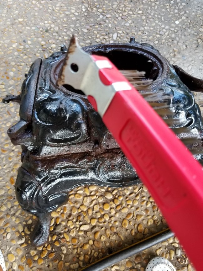 Scraping off the flaked rust. So, I figured I have the time and energy to manually clean these, and decided to restore the iron for as little as possible. I started out with WD40 anda wire brush with a scraper on it, that I picked up at Walmart. I sprayed the pieces I am cleaning with the WD40 and let it soak in.