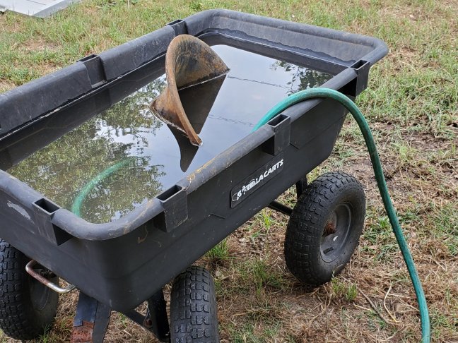 Giving the antique school bell a good rinse after the acid bath.painting the bell after giving it a day to dry out in 100+ degree heat.