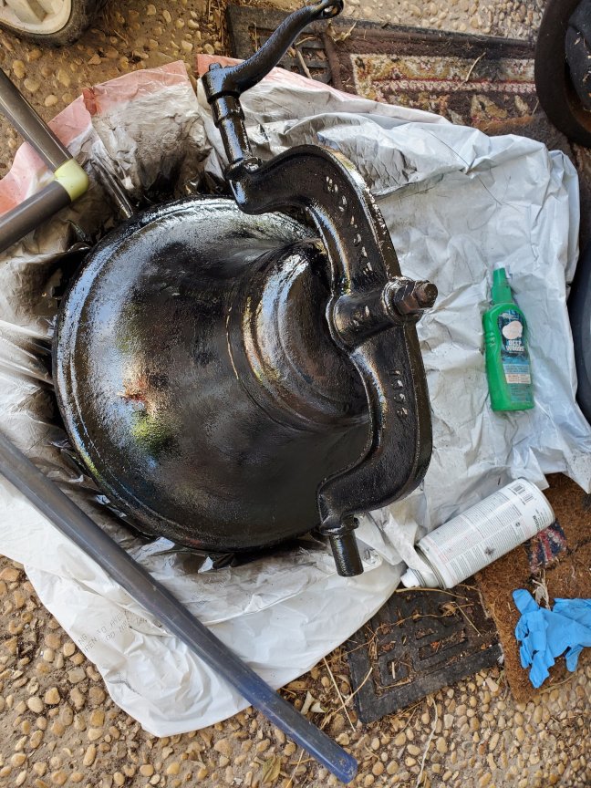 Once the pieces are done, wipe the excess water (you rinsed them off with) up with paper towels. Leave them in a protected area until you are ready to paint. I am buying a quart of high heat, satin, black paint. I’ll be applying it with a paint gun. There will be a thin layer of rust on these from our humidity. I may or may not try and remove it before painting. I’m guessing not. These aren’t ever going to be rust free. But, hopefully, with a few layers of paint: I’ll help these stay in good enough condition that my future grandchildren can inherit them!