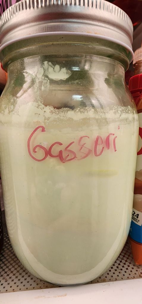 If you aren’t into eating a bacteria’s poop, you can strain it out by pouring your probiotic through a sterilized seive into a second, sterilized jar. I don’t really care. I’m trying to stop a sterile gut, so I figure why bother, more yuck = less sterile. So, I usually just leave it in there. It won’t hurt you.