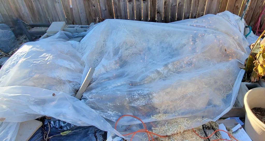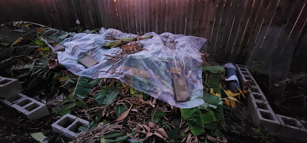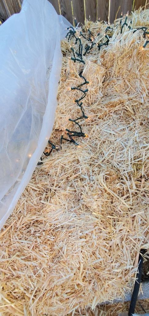 It’s hard to see in this photo but I just cut all of the bananas down and added a tarp. I didn’t bother with straw or lights this year.