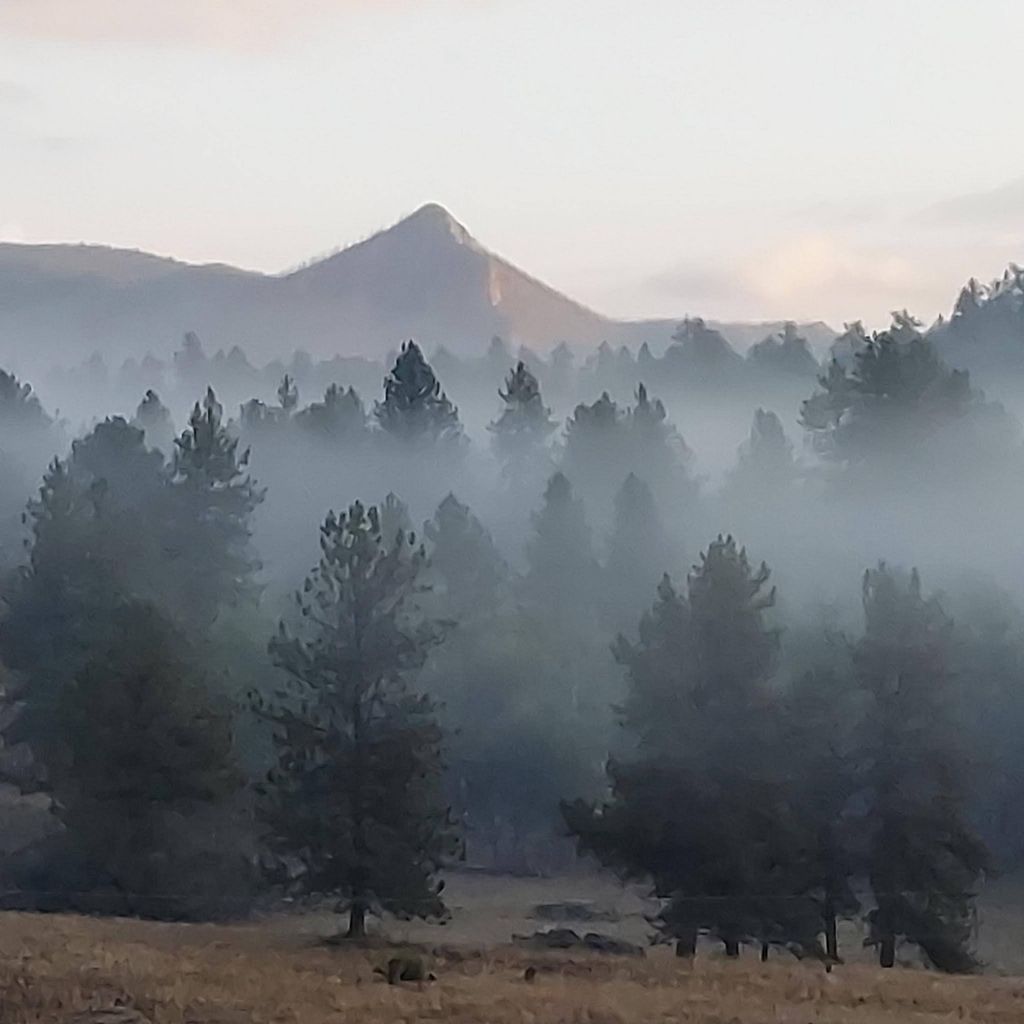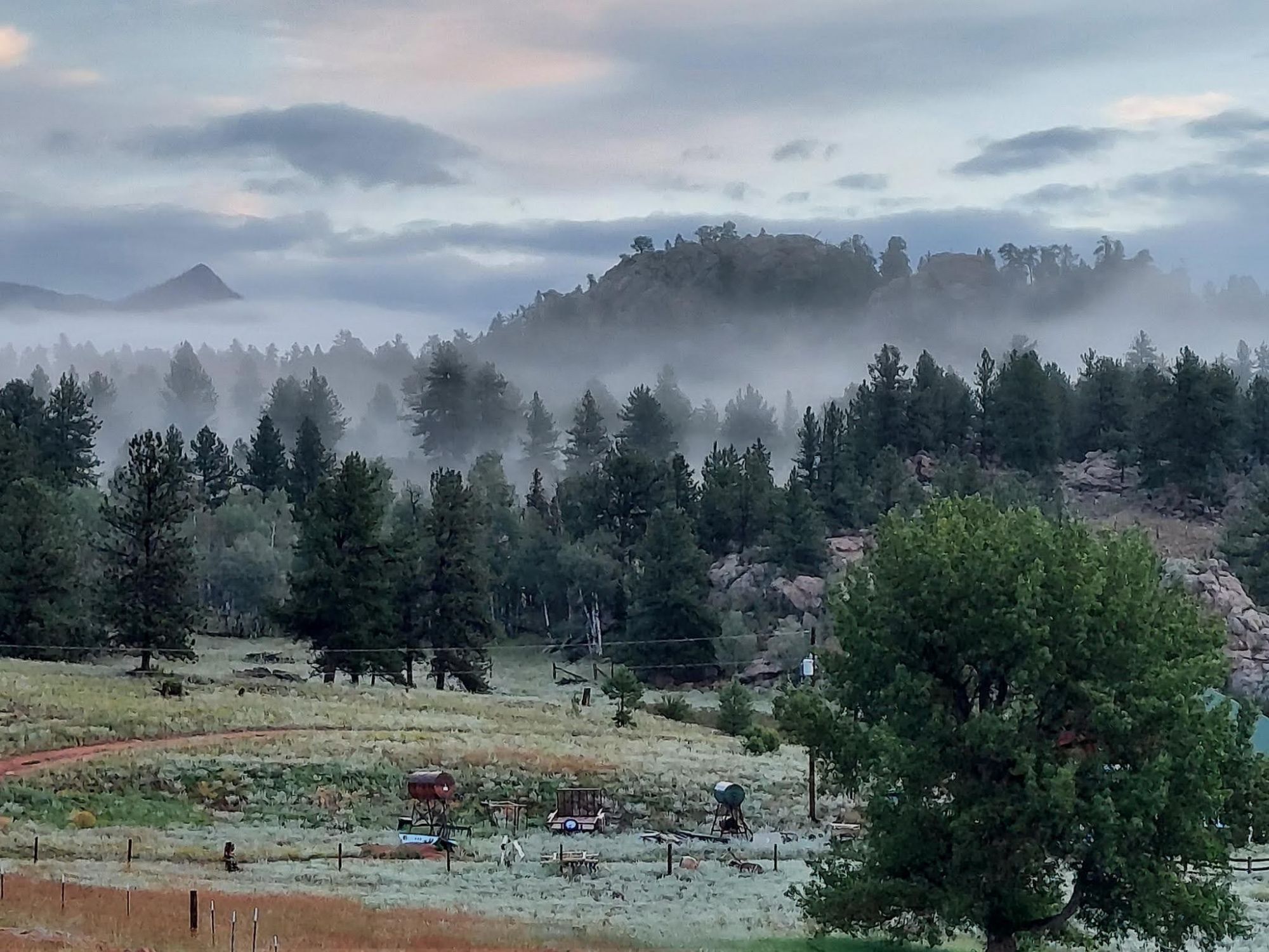 Photos my mom sent me from her front porch of the morning mist at her ranch in Colorado, 2023.