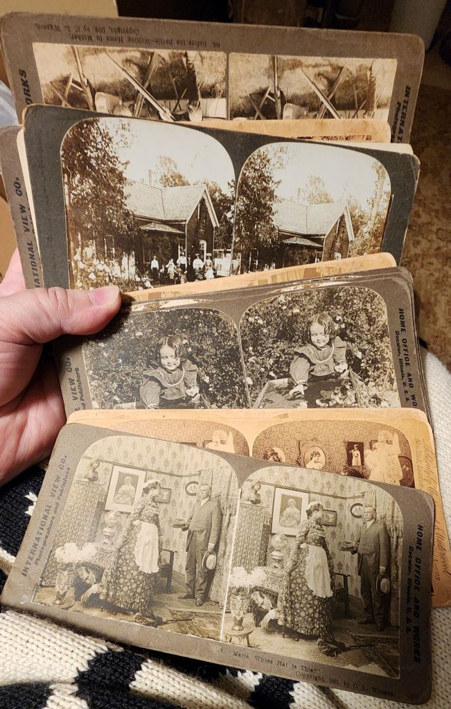 It was what you did for fun in the evening after chores. Way before: streaming, cable TV, black and white console TVs. These were made when radio shows were just starting and Hollywood was creating it’s first silent films. These photos are from the late 1800s-early 1900s. Happily, I found a complete stereoscope for about eight dollars plus shipping.