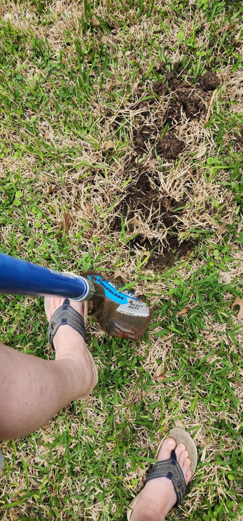 I believe that is why I lost the first two pawpaws. Pot culture for trees down here is really risky without drip line. Your pots dry out for two days in 100° heat, and you occasionally have this happen over an entire summer: your plants go into decline and die. This drip line will create an oasis and hopefully the amount of work I’m doing for the holes will create something special. Something that, hopefully, will let me grow something I’m not supposed to be able to grow.