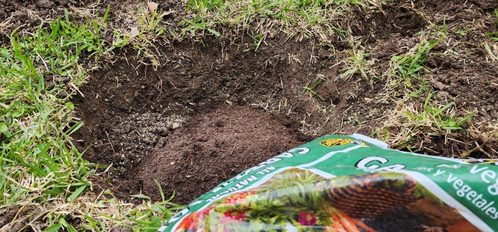 Nobody grows plants directly in our soil. We all have raised beds and pots. But, I’m planting two trees and for that you need to plant them in the ground. These two trees are not recommended for my area. I have had two pawpaws before but they were in pots. One lasted two years, the other lasted three. Why am I trying again? I’m putting them in my specialty holes that I dig, in the ground. Will they make it? Who knows… It’s an experiment.