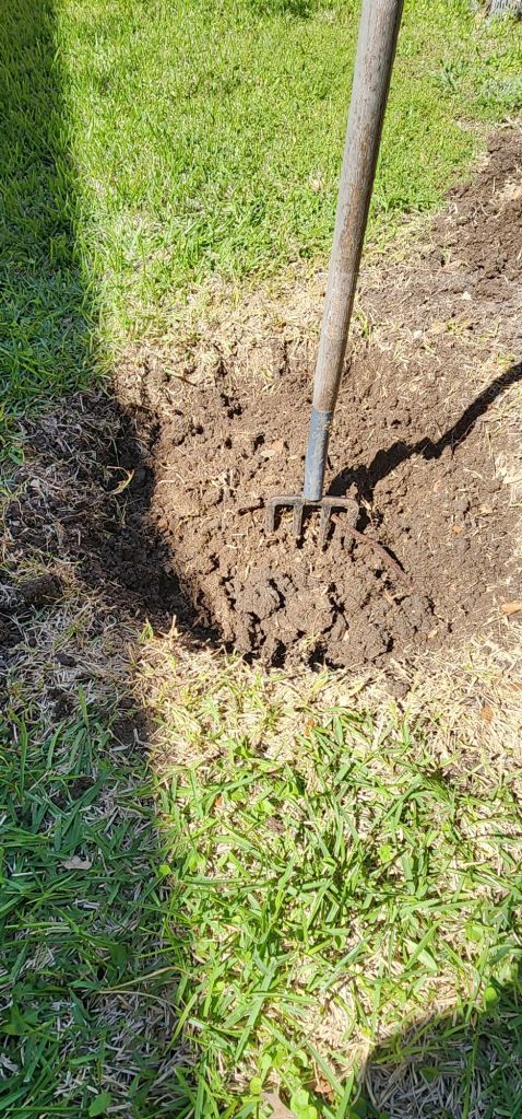 Anyway. Not only am I digging a giant hole and using a tined fork to dig a couple inches lower and then pound a piece of rebar in (to open the rock at the bottom up): I am building this hole up into a shallow raised bed above the native soil. This is the only way I can keep the soil’s super high pH from the roots of these trees. Eventually, as they grow: they’re gonna have to deal with what God gave me here, or they’ll fail. Possibly without ever fruiting for me because of the chill hour issue. But. We’re not going there. Right now, I’m creating the best conditions I can, and that means removing native soil and replacing it with something more appropriate.