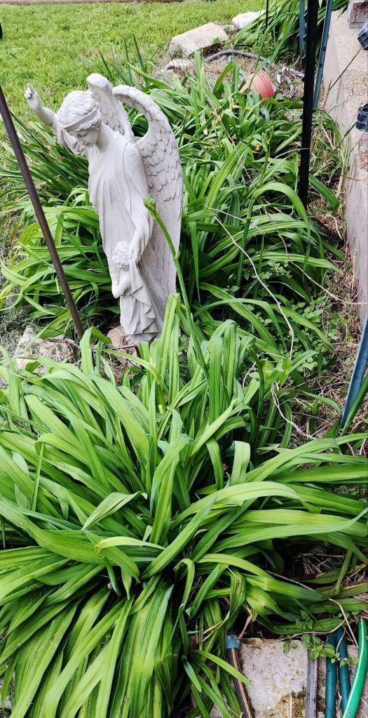 This is how I used to start things when I had no natural shade.You can see how I created shade for seedlings. I need to divide these daylillies and I haven’t weeded or planted in here yet. (I’m really behind this year.) But this set up is ideal for starting vining plants on trellises and still keep their roots cool and moist over the summer. You don’t need to strip everything back to bare soil to be successful. I run a soaker hose along this open area near the porch and grow beans, or squash, or melons, on trellises. Plus, this gives natural habitat for lizard, toads, spiders and other insect predators.