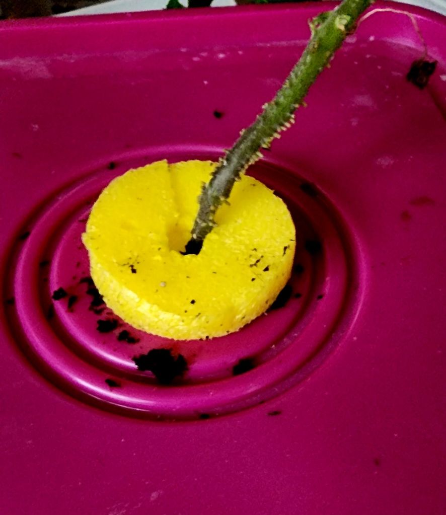 Place your piece of noodle around the stem (I had to cut an extra slice out to make it fit). Force the noodle into the hole in the bucket and add small slices of noodles to the central hole to keep your plants from sliding down too far into the bucket.