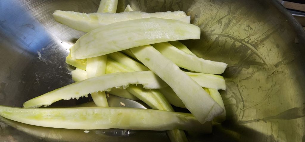 So, for the fruit mash that you add at the beginning: I tried a few things that were OK, but that I changed a little in subsequent ferments. In the first gallon that I made, I peeled, seeded and sliced about four pounds of Armenian cucumbers.