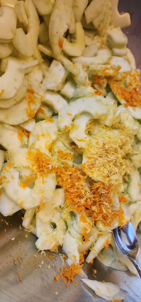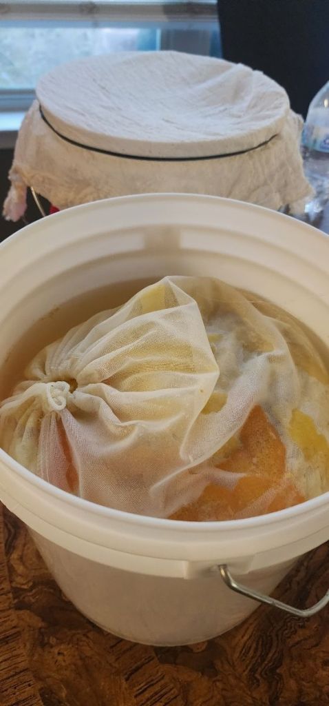 I put them in a fermentation bag and then zested and juiced two oranges and two lemons. I then used a meat tenderizer on a finger length piece of ginger, it generally holds together like this. Plus by mashing, instead of slicing, I didn’t have to fish little pieces of ginger out later.