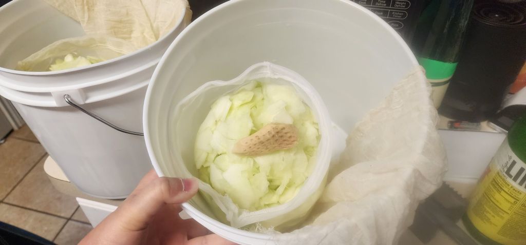You can attempt to weight the bag down, but honestly: it has so much gas in it when it is fermenting that it floats, regardless of what you do. Even three glass fermenting weights didn’t help. I had heard this, but I figured I could find a work around. I couldn’t.