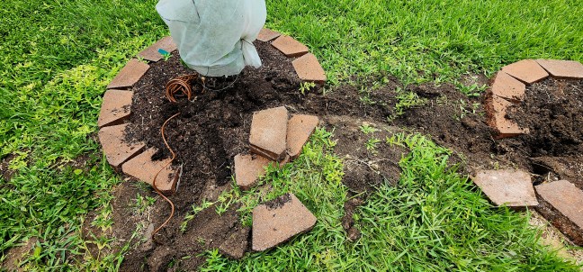Well it’s a day for a storm. The heat has been bullied back into its corner and I was free to do some work outside. The dripline I’m running is brown. It’s really rubbery and easier to force onto the emiter posts. The downside of working in the rain is: the thick clay gets slippery and sticks to everything, including my flip-flops.