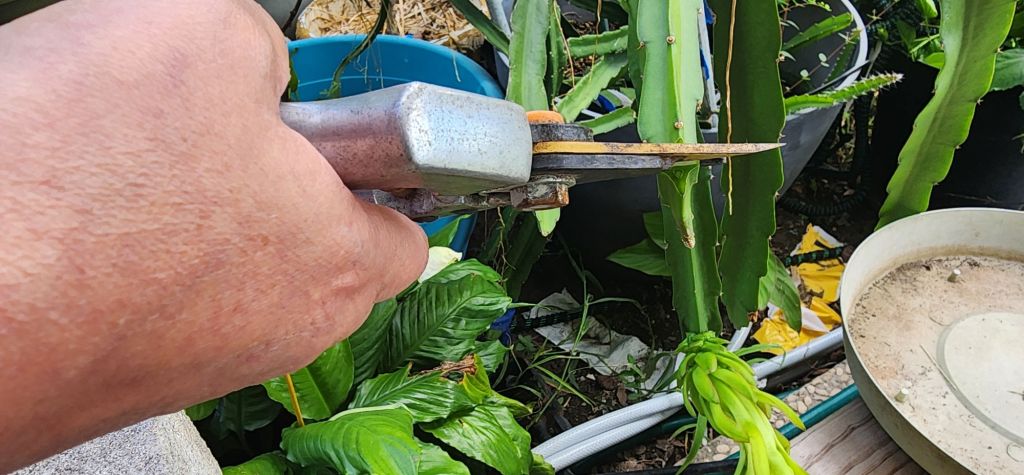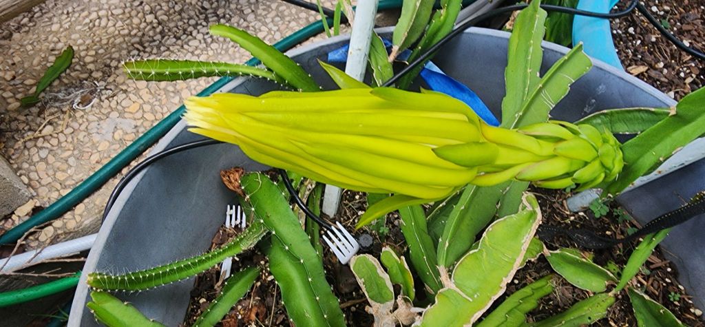 I went out and tipped the branch ends on the dragon fruit to induce more flowering. This is an “Edward’s Baby” and is supposed to be self fertile. I got this as a live plant cutting from rareseeds.com There’s a yellow fruited one in this pot, too. But it’s only a year old. I got it off Etsy. I think it needs another yellow fruited pollinator.