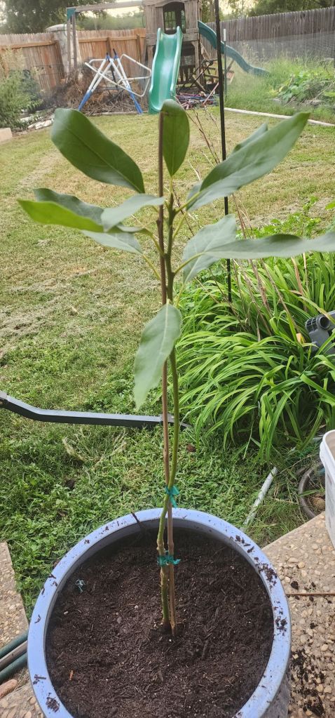 Until it’s grown some roots this is going to be potted. I’m planning on moving it out to replace the pear once I get that cut down. This was clearly grafted from an avocado pit, I’m hoping not something even less cold tolerant, because that is going to make it more susceptible to our sometimes cold winters. Guess we’ll see!