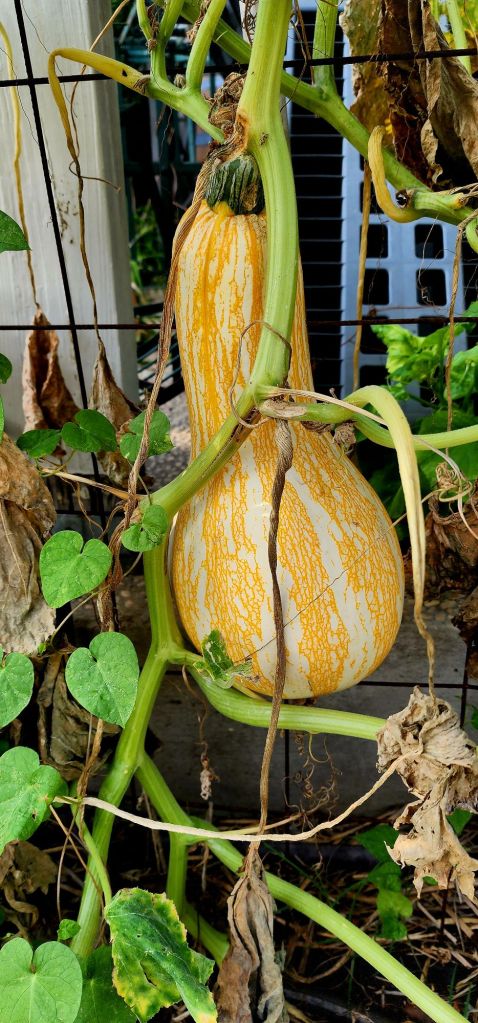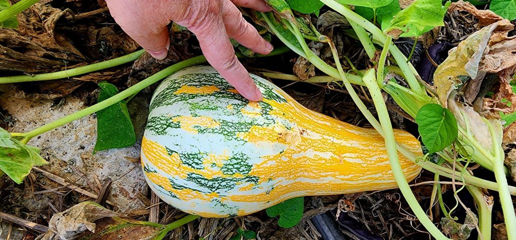 To harvest: Watch for the tendrils near the fruit to start dying back, the vine dying back (which means no more nutrition or water is reaching the fruit) and try pushing your nail into the skin. You shouldn’t be able to pierce the skin when you do this. If you can, it’s not ready. Cut the fruit off and leave some tendril. This will help it dry outside of the actual meat of the fruit. Your squash should be a vibrant color and heavy.
