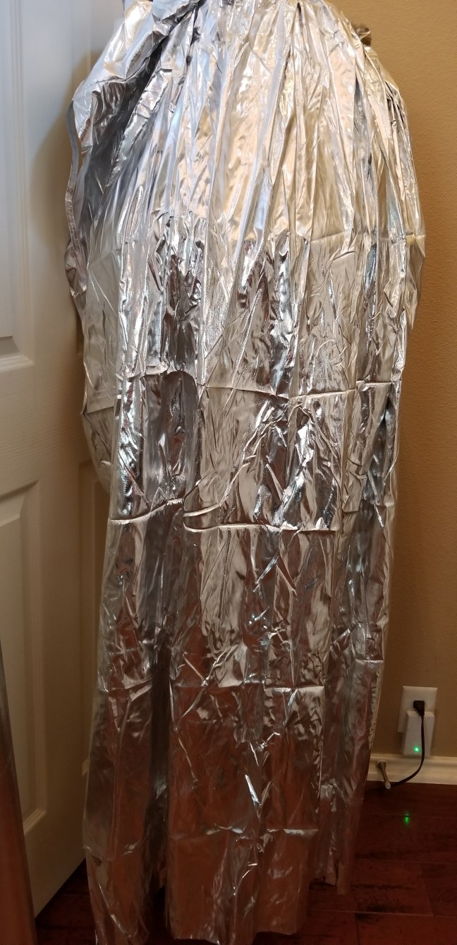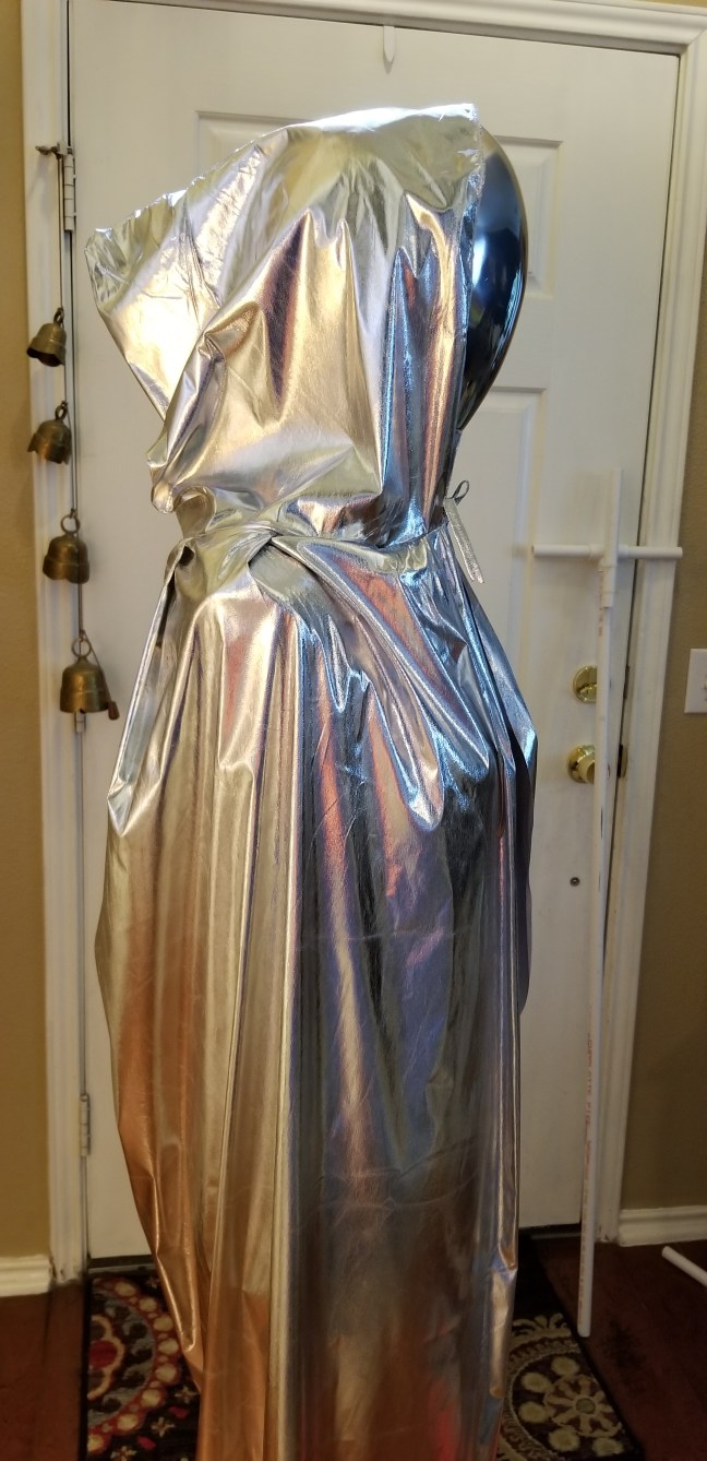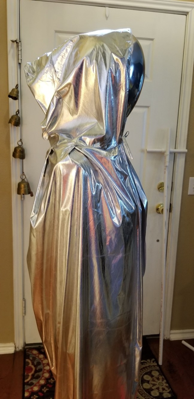 Because the cape is so reflective, I’m glad I used a dress form rather than just wrap the PVC frame with bubble wrap. It does make a difference in the finished project and it really looks like there is a person under the cape. It takes more time, but it’s super inexpensive. I don’t mind putting time into something if it makes a big difference. I do mind throwing big money at Halloween decorations! This is a great, cheap project that is scalable as far as time investment.