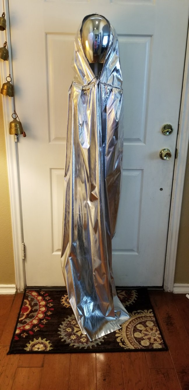 Happy Halloween! This year: Silver Faceless Aliens! They are human height and shape and creep everyone out! I instantly had the idea after looking at this mask. So much fun! Like all of my projects: it’s super cheap and has a big impact. I’m making four.