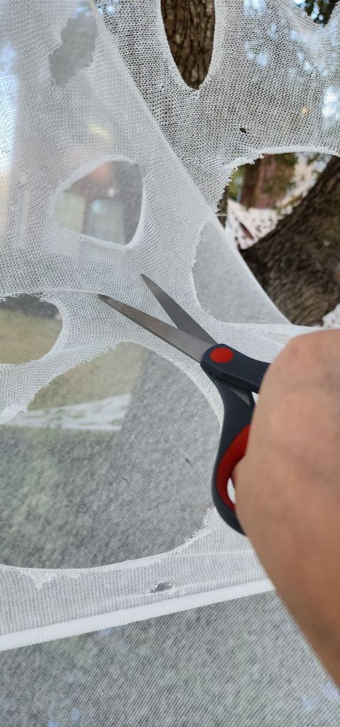 I tried a lot of ideas to see what I would cut this with. I recommend brand new, really sharp, scissors. None of my older scissors would cut through this. Razor blades were useless because I already have them hung. It just wasn’t effective. If you sew, don’t waste your sewing scissors on this. I ended up cutting some grass lower on the webs, which dulled the edge. Just buy a cheap new pair of office/school scissors.