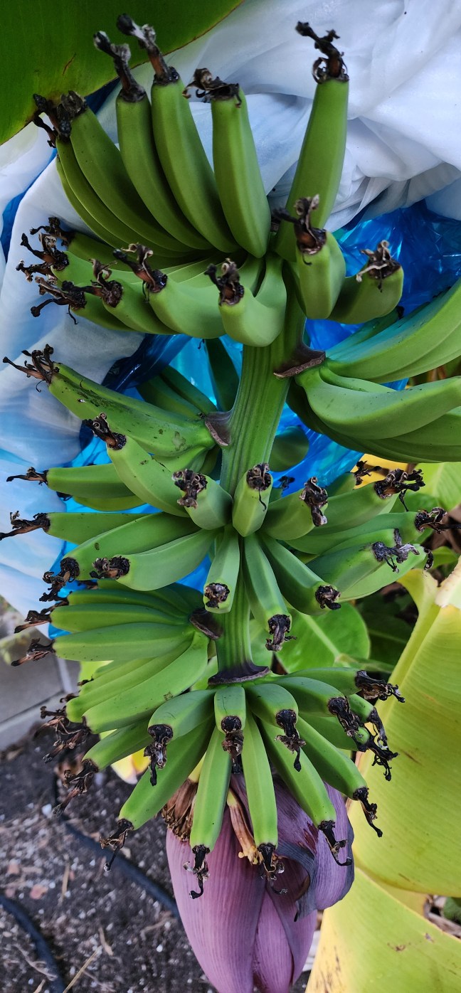 That’s a 6 foot privacy fence back there. These guys are huge this year and I’m a little nervous to get my pole saw out and start cutting them down. They are very, very heavy as they’re about 90% water. I’m not into risky tree felling, I slice sections off until I get to ground level. But, this year they are super tall so I’m slightly concerned. I always cut them down at the end of the year, because: I cover the bed with a plastic tarp to keep the rootballs safe from a freeze. It’s a lot of work to grow tropical, fruiting bananas in zone 9a. But, I’m doing it!