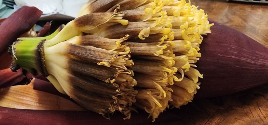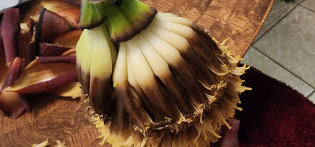 Kinda reminds me of cleaning artichokes, but I am 100% into eating those! BTW the little bananas at the base are not what people eat. They eat the inside of each flower and that’s a heck of a lot of work, plus they brown quickly like banana fruit does.