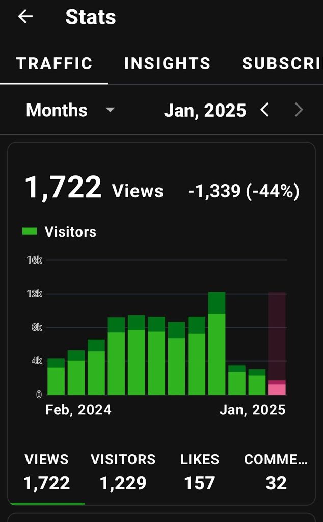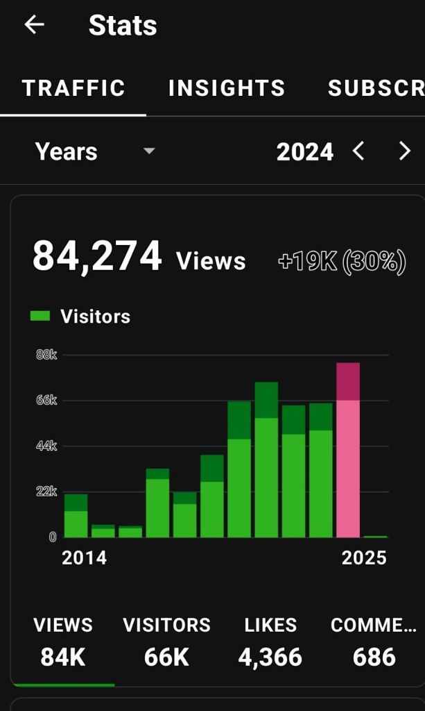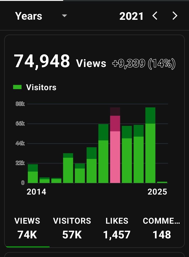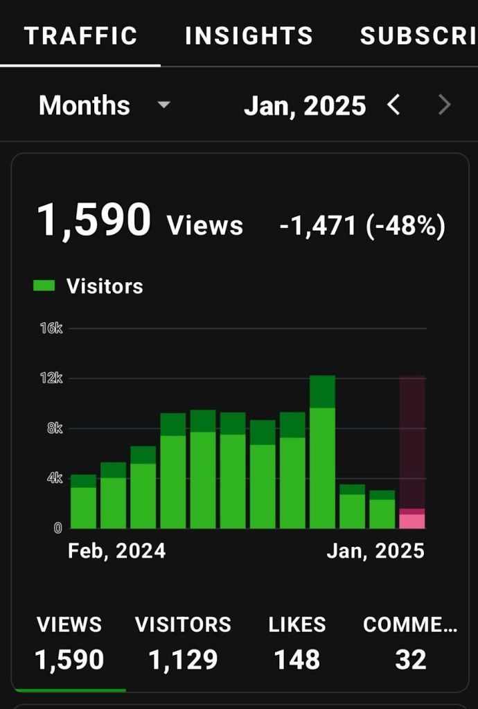 The highest viewership before 2024: I was picked up by a large aggregate site and I had an article published in a magazine. Interestingly, the two years before 2023 my husband was working out of state and I had exactly zero time for my blog. That aggregate site that picked me up did a lot for me, and I’m grateful.
