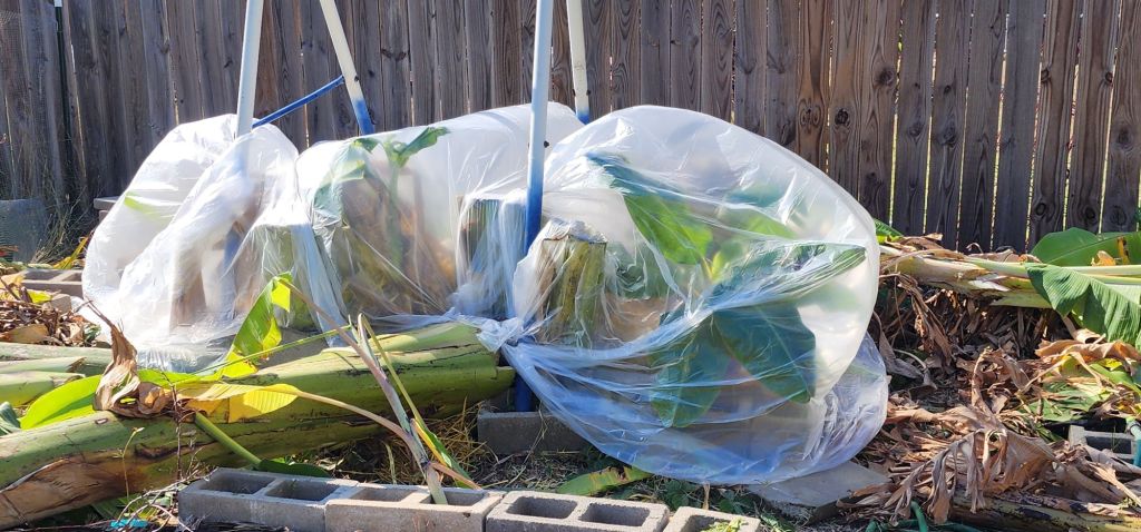 However, all of my bananas in spring 2024 started at ground level from the rootball (that is about four or five years old now.) This year I’m starting with last years pups that I cut down to about two feet high. I covered everything with a thick layer of straw, then thin plastic and finally some thick clear painter’s tarp. I didn’t know if I’d lose everything to freezes. Turns out I didn’t.
