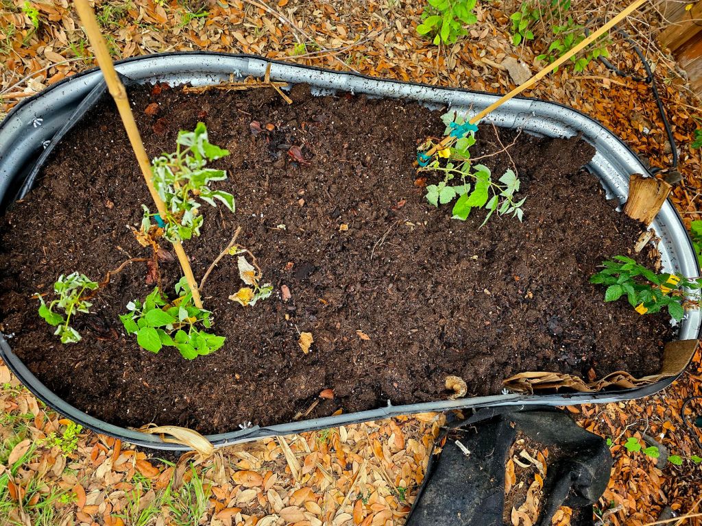 I decided to fill and plant the metal beds. I don’t think I’m going to leave these plants here permanently because one is a blackberry and two are raspberries. I’ll have to think about it. All are from a Florida nursery called Just Fruits and Exotics.