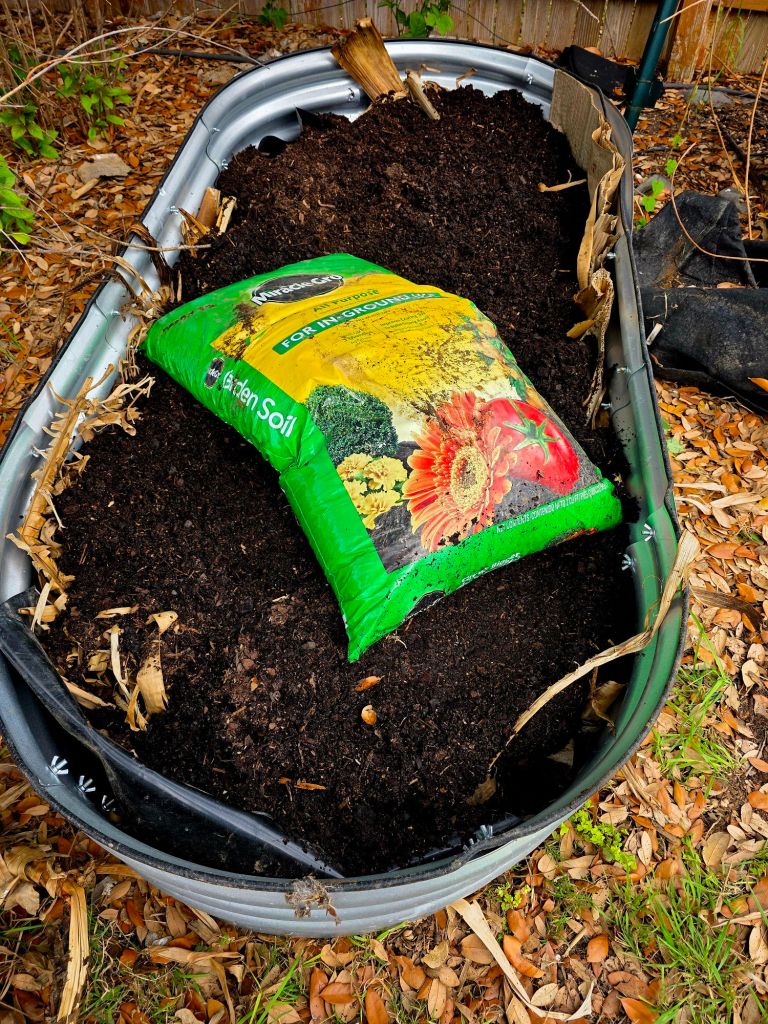I had about six bags from last year. They were wet and stinky. I am letting that bed dry out before I plant it. If you end up with some anaerobic decomposition: opening up whatever it is in, and spreading it out, will kill the anaerobic bacteria and fungus. It happens just by exposing it to oxygen. Then it’s fine to use. I always wait until the soil stops stinking, before I plant anything in it. So the second bed is sitting there draining and reacting to it’s new oxygen access. I’ll wait a bit and then put my plants in it.