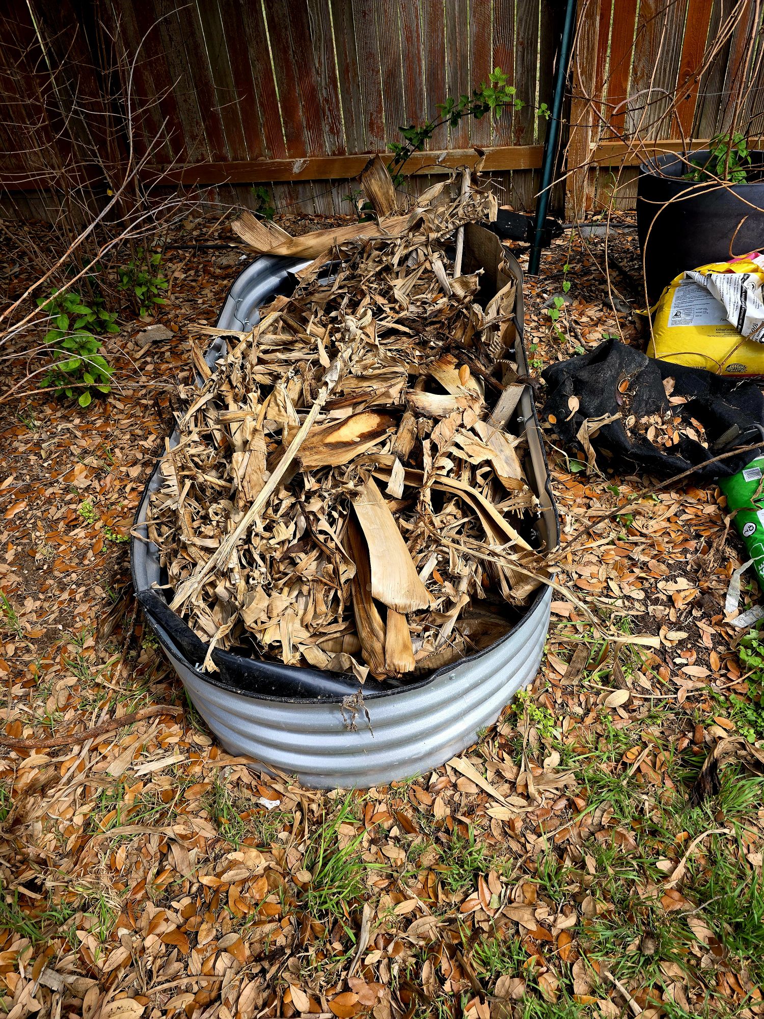 After lining both beds with plastic and cardboard: I stuffed the beds with banana waste. One of the great things about having a mature yard is the excess material you get from pruning and shearing or raking up leaves.