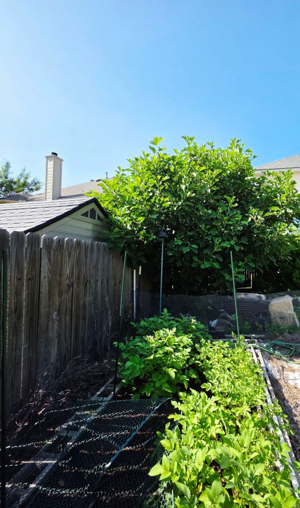 The fig is taking over this side of the yard and is hanging over into the neighbors yard. Figs do not have a top size. They just keep growing. I have it where it is, so that there’s some privacy. But, I think I may cut it down this fall and replace it with a better variety. I have a Celeste and a black mission fig in other parts of my yard.