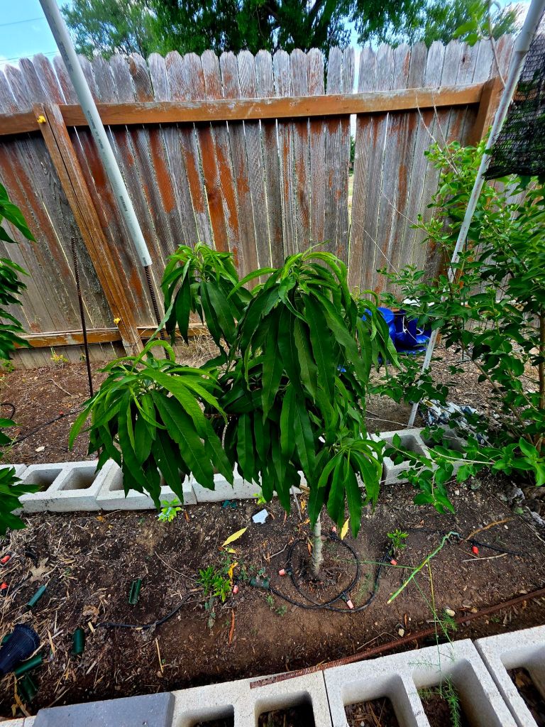 The ginormous pomegranate bush next to my hugelkulter high density fruit bed that has a shade cloth over it.
