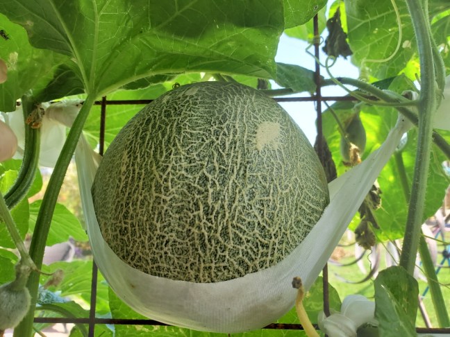 Happy melon on a DIY trellis sling. You can see the vine is loose and there’s no pressure from the weight of the fruit.