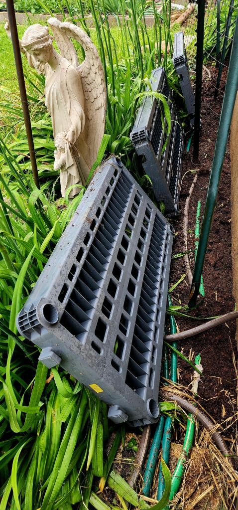 I said in a recent post that I plant behind my daylillies to keep the roots cool and shaded on vining fruits. This year I’m only doing winter squash on my supports. But, this is how I do that. I get the weeds out and then tip something (these happen to be plastic shelves) over the leaves to keep them out of the way until the vines get going.