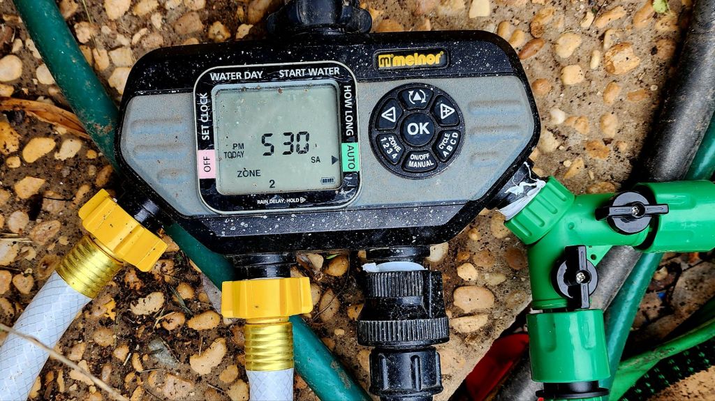 This timer has dripline (for both my pots and my yard) , and a soaker hose attached to it. (I have had three soaker hoses bite the dust this season. Really irritated that they don’t last. I take the timers off and bring them indoors for winter.) Couldn’t find shorter, reasonably priced hoses so I used a hose for “potable water” for RV’s. I find it really weird that garden hoses cost way more than a potable water hose.