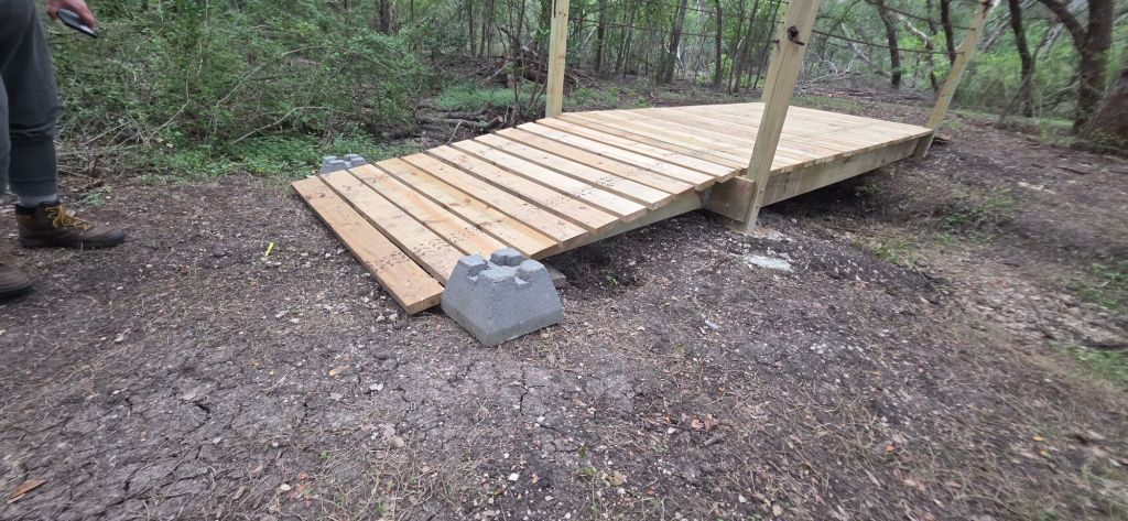 We tried to accommodate her handyman’s bonehead instructions on placement, and her constant meltdowns, for over a month. We also were doing this during the floods near San Antonio and some days we were working in flowing water half way to our knees. We were able to get an extension from the council, as we finished the first bridge before his 18th birthday but couldn’t finish the second one in time.
