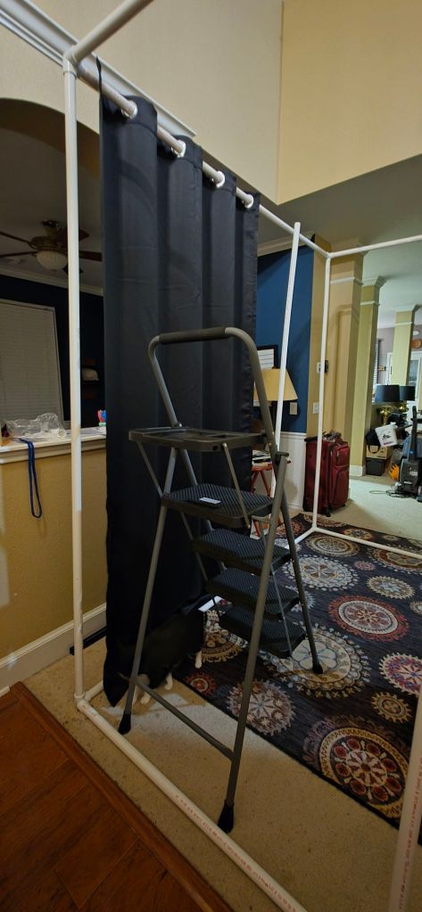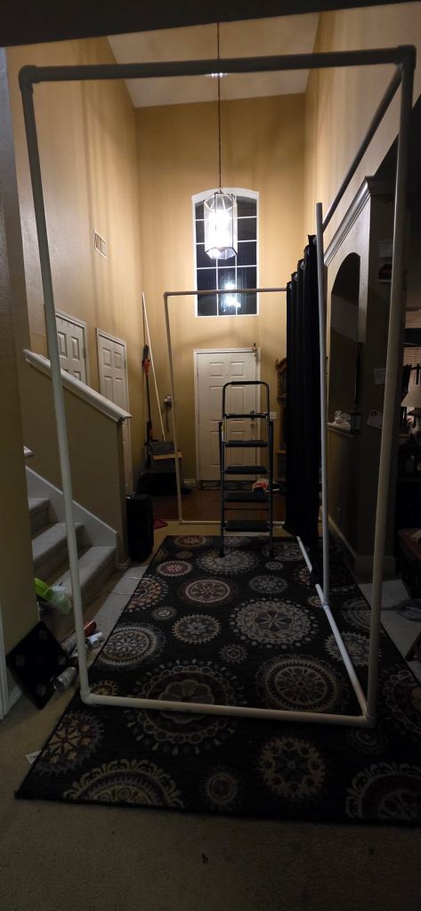 There’s another set of pvc pipes for this corner but he needs 2 more drapes to finish this. So. We left it undone. It currently comes out away from the shelving.