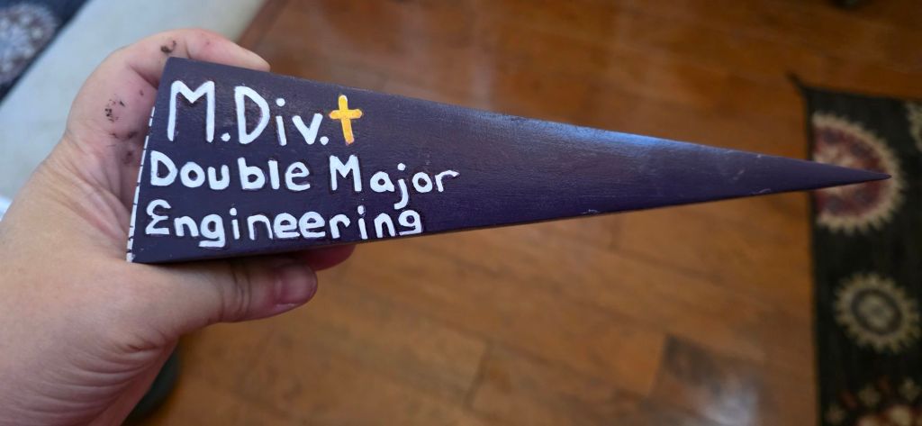 My son is double majoring in ministry and engineering. He’s also an Eagle Scout who’s been to Philmont a few times. I ordered the engineering flowchart plaque on Etsy and we used a wire plate display support under it (or just buy a poster, wayyyy cheaper!)