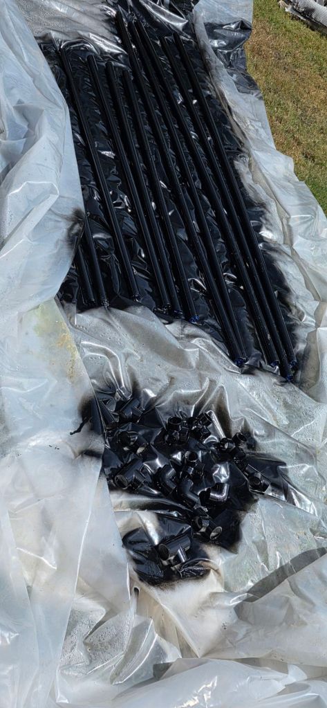 My son wanted to paint the pvc black, so that’s what we did. I tried two methods. One: I painted everything on a tarp. I could only get one side at a time and had a bunch of spots to patch. Second: I drove some rebar (I am always using rebar in my garden) into the ground and set the pipes on them. I had 360° coverage and the paint went a lot further.