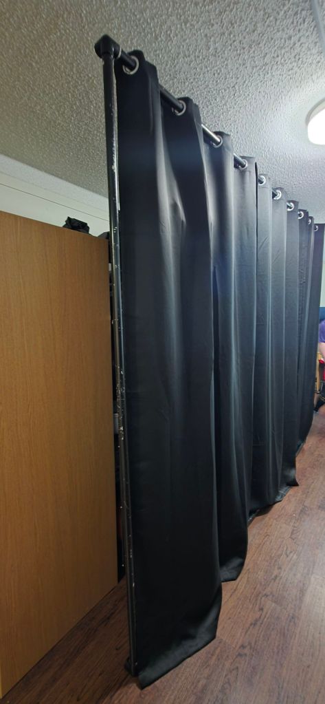I bought four 52″x95″ black out drapes (make sure you match both of these measurements!) that are hung with rings, from temu. (which is where most of his dorm stuff came from. Watch out on that site. The products are the same as what Amazon has, but cheaper. However: temu has games and “deals” that I recommend skipping because those are mostly scams. Watch the “add to cart” button too because it will switch to “buy cart now” and I have had several orders I’ve had to cancel and then wait several days for a refund. You can get good stuff on there but you can also get scammed with the “extras” they have.)