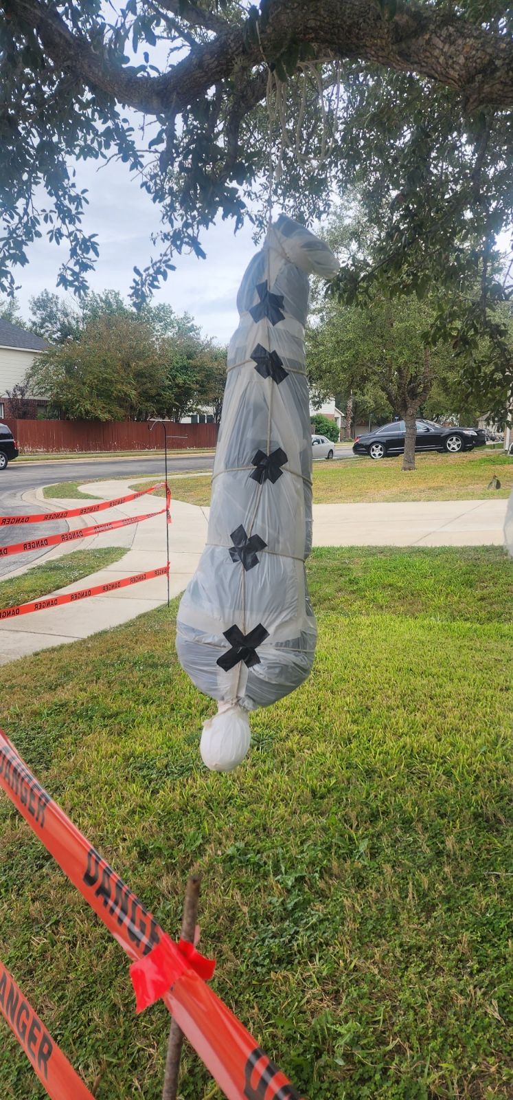 I live in South Texas. Halloween celebrations are almost as big as high school football down here. I have seen some amazing stuff (and I’m a little competitive, craft-wise!) and we have learned to really get into and appreciate Halloween. A couple of years ago I made some packing tape ghosts. Last year I made a dead body and some ghosts with styrofoam heads covered with cheesecloth. This year I’m focusing on spiders, grave stones and witch circles. It’s a good thing we have a big front yard!