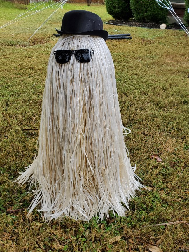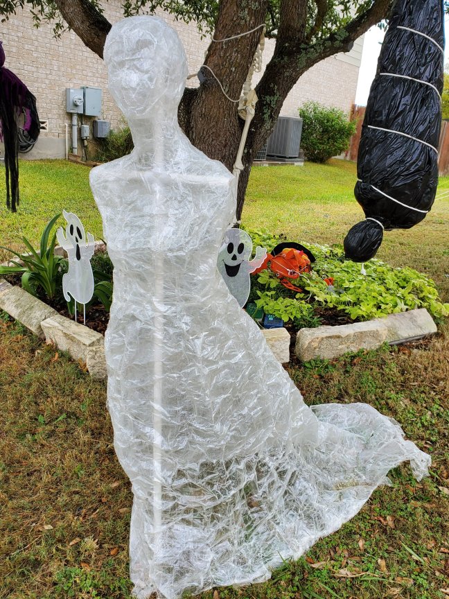 This is the last year for the packing tape ghost. She is finally falling apart. I am planning on making another one. She’s over ten years old at this point. Up until this year, I would just put her over the form and Styrofoam head I made her on stretch her out and add a few pieces of tape for reinforcement. Next year I get to make a new one. These decorations can last a long time if you are careful in how you store them.
