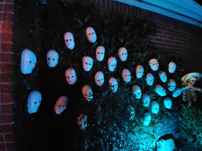 This year we added 48 masks to our vines and bushes that you can find here: Bulk Masks (the prices on these skyrocket right before Halloween. I got 48 for around $12, but I ordered them in September.) I ended up adding some clips so that they would sit right. I love my glue gun!