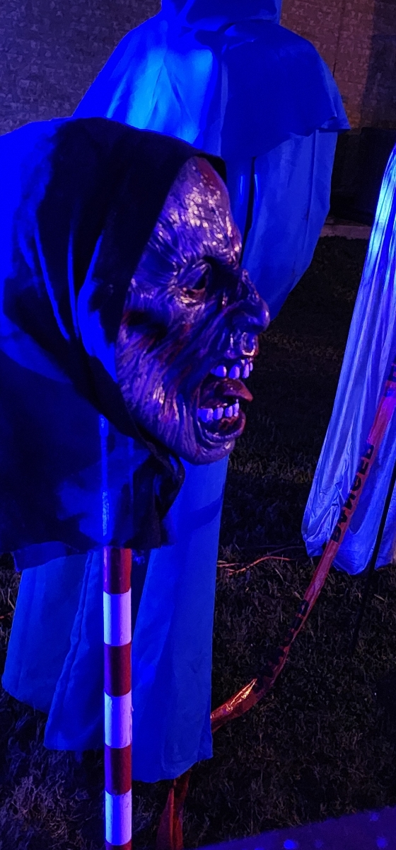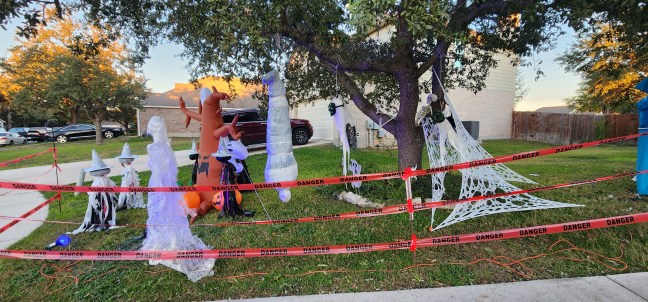 Every year we put up shepherd’s hook posts with warning tape. This is the icing on the cake and keeps trick or treaters from cutting across the yard and getting hurt or tangled up in something.