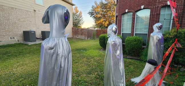 Faceless aliens, they’re life-size and seriously spooky. My son is dressing as one, this Halloween, to scare people coming to the door! He’s super excited! (I’ve included one photo with my son as an alien. Can you tell which one is him? I’ll show you at the bottom of the post!) You can learn how to make these here: Faceless Aliens.