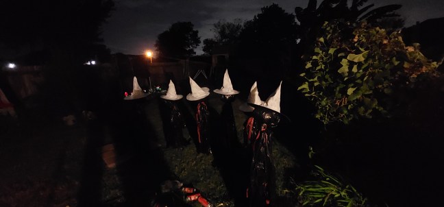 The witches with white hats. I just sprayed them with white spray paint. I’m slowly working through them to put white trash bags on them so they show up with the black lights I have.