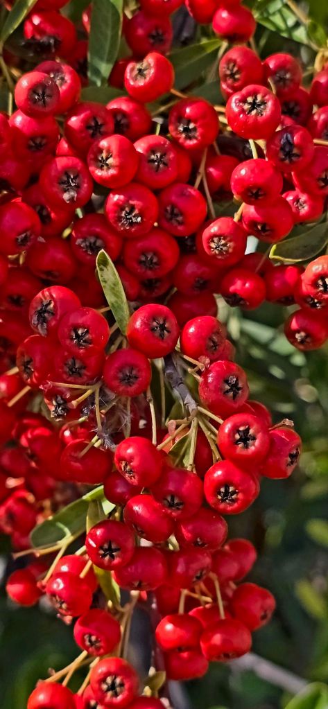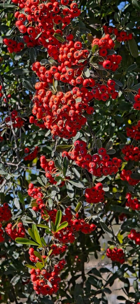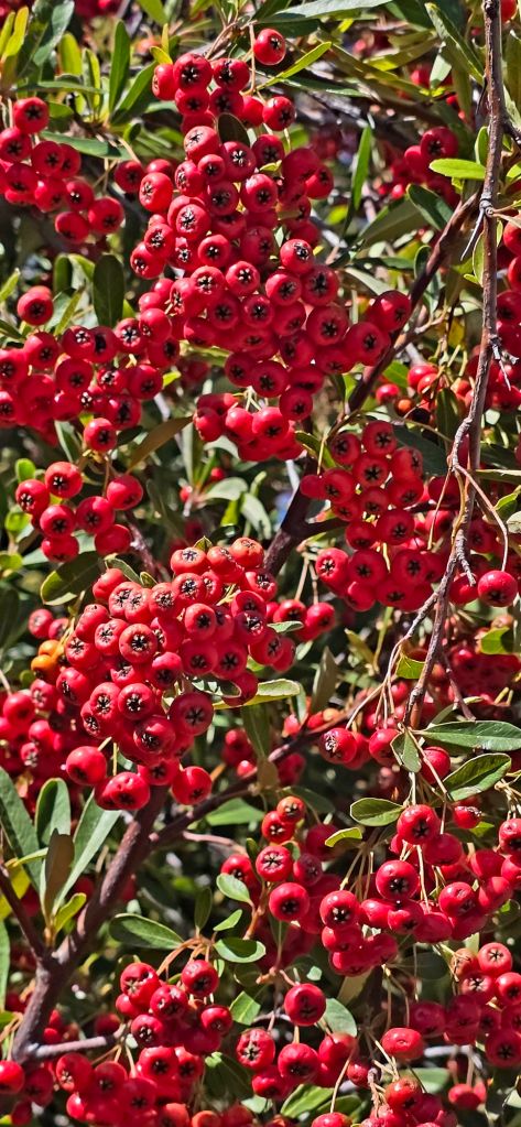 These are edible, which was a surprise for both me… and also, I surprised my mom when I shared that fact. We’d always assumed they were poisonous. When I was growing up the rule I was given was: watch out for white or red berries because they are usually poisonous. Who knew that was an old wive’s tale!? Pyracantha have a watery, apple flavor. People use these mainly to color jelly. Most Pyracantha jelly recipes call for apple juice to give it some flavor.