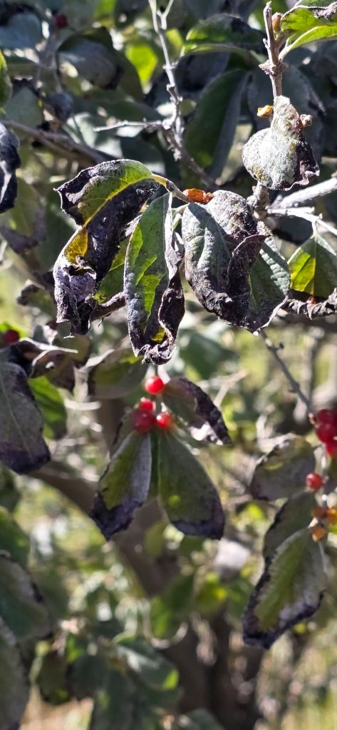 Invasive honeysuckle with a fungal issue. (poisonous red berries, so I guess the old wive’s tale isn’t totally wrong.)