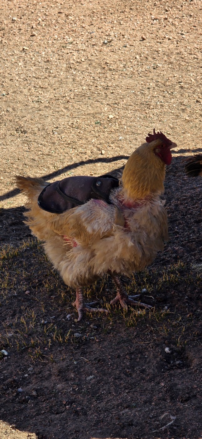 Bwahaha! That’s the first thing I thought of when I saw all of the hens scooting around with the shields on to keep the roosters off their backs. OK. Maybe only I see weird concepts like that. But I thought it was hilarious.