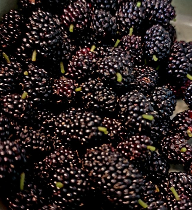 Tons of Dwarf ever bearing mulberries. Morus nigra are supposed to be the best tasting of the mulberries. If you look online, experts on mulberries say the dwarf ever bearing variety is not a nigra. So, even nurseries mislabel this tree. If you want the nitty gritty try this link. These were sold to me … Continue reading Munch Mulberries Much?